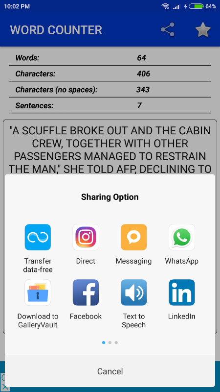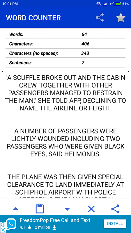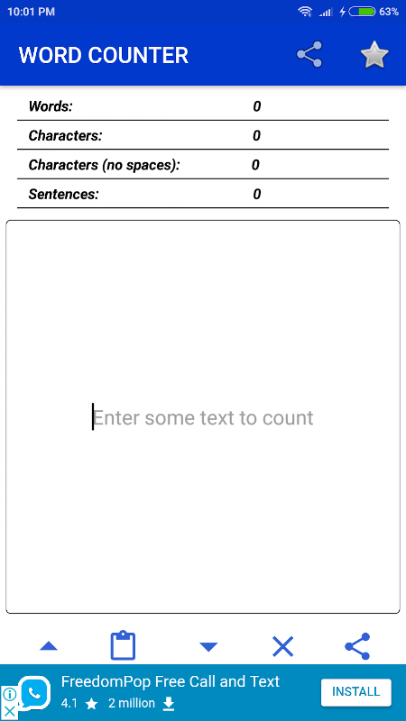 Word Counter adalah alat teks yang percuma dan mudah digunakan untuk menghitung kata, ayat, dan watak dalam teks anda. Anda juga dapat menyalin teks ke dalam aplikasi, menulisnya di kawasan teks, mengubah teks huruf kecil menjadi huruf besar, teks huruf besar menjadi huruf kecil dan juga membersihkan teks anda dengan mudah.