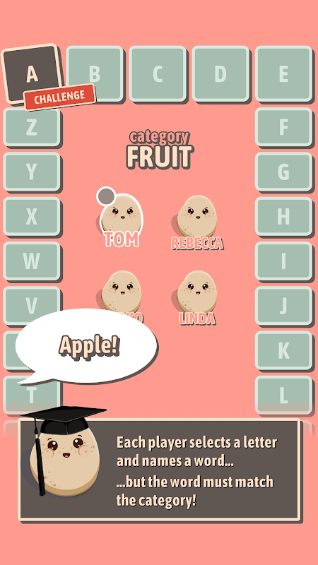 Pilih huruf, namakan perkataan yang bermula dengan huruf itu. Tetapi berhati-hati – jika perkataan tidak sepadan dengan kategori yang disediakan, anda akan keluar!