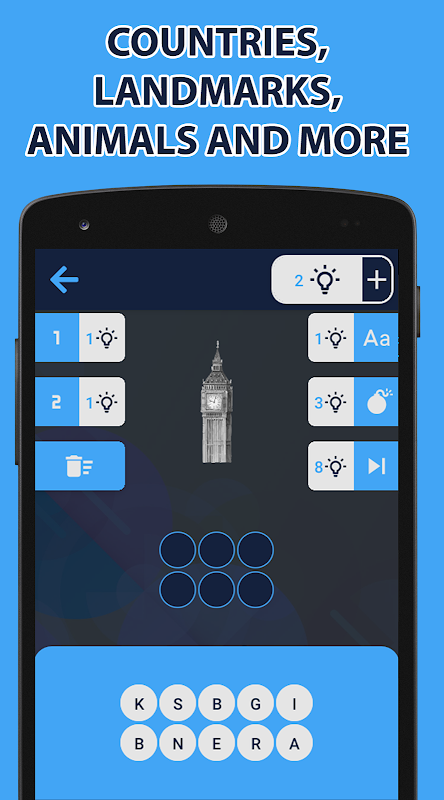 If you do not know the correct answer, you can get help to choose from different options: get a clue (fact about the image), display a letter in the word, remove letters that are not part of the answer, automatically fill in answer (skip).