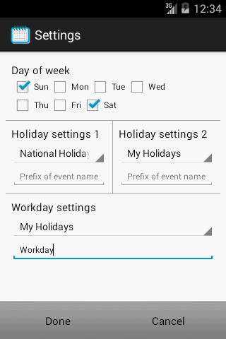 -Pengaturan percutian: Tentukan hari cuti mengikut nama kalendar dan nama acara. Sekiranya anda tidak memasukkan nama acara, semua acara akan dianggap sebagai hari cuti. Oleh kerana anda boleh menetapkan dua tetapan percutian, lebih baik menentukan satu untuk cuti umum dan yang lain untuk cuti kerja anda.
