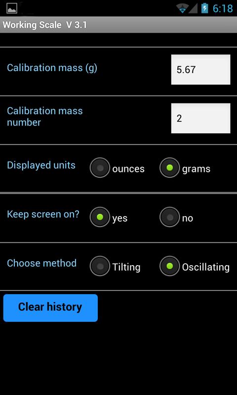 This app is designed to make use of the spring-like properties of common objects in combination with a known mass (a "calibration mass") to measure an unknown mass. Two different methods are employed by "Working scale". The first method measures the tilt angle of the Android device when an object is placed on it. The second one measures the oscillation period of the Android device when an object is placed on it and they are set in motion when resting on a springy object (a meter stick or yard stick). The app tracks your device's changing angle using its built-in motion sensors.