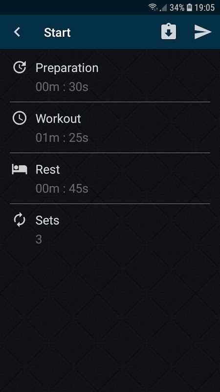- Konfigurasikan latihan (masa persediaan, masa senaman, masa jeda, bilangan ulangan)