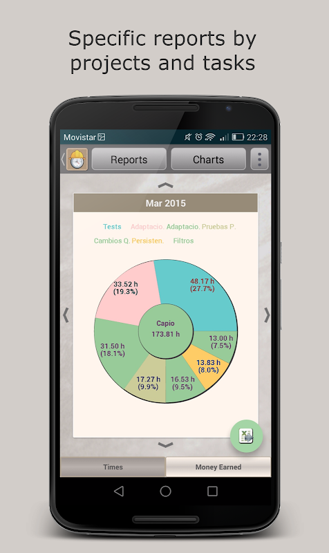 - Reports and charts with the time worked for each project, and the money earned in each of them.