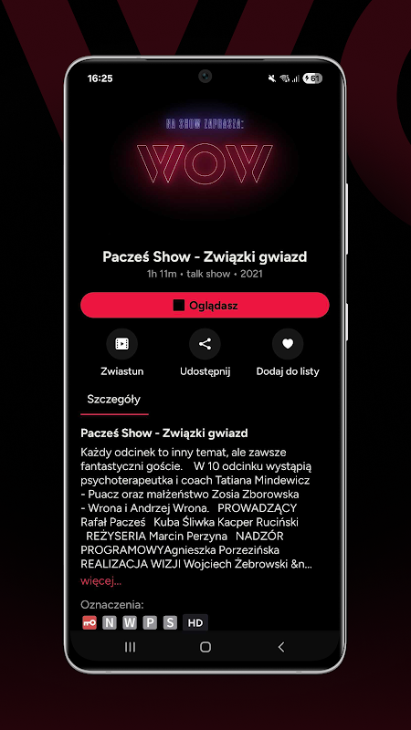 Selamat datang ke WOW. Kepada aplikasi yang memberi anda akses kepada hiburan Poland paling hebat yang ditawarkan oleh platform wow.show. Kepada blogger yang anda suka ketawa, marah atau… sesuatu yang lain. Kepada program yang dirakam di sini dan sekarang - menunjukkan realiti sebagaimana adanya. Kami menjemput anda ke dunia permotoran, untuk memecahkan stereotaip, untuk mengalami percintaan dan godaan, ke tanah nasihat… tonton, komen, dan berseronok! Puluhan program unik kami yang anda hanya boleh lihat di WOW.