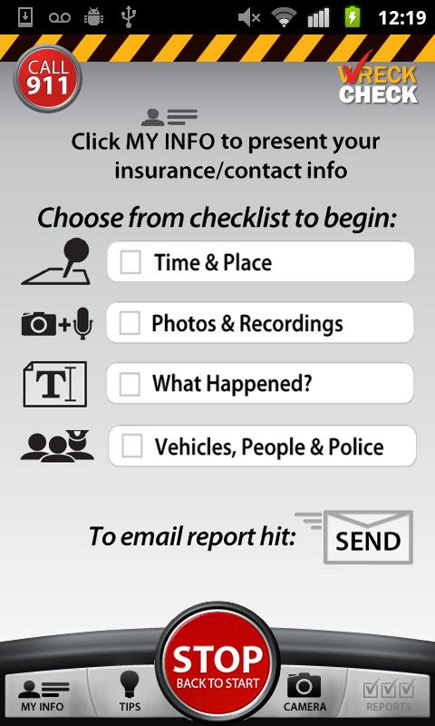 The WRECKCHECK auto accident checklist and mobile app from the National Association of Insurance Commissioners (http://www.naic.org) guides you through the steps to take following an accident. WRECKCHECK helps you determine what information to share, with whom, and what details are important when filing an insurance claim.