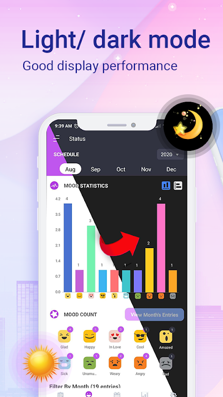 🔅 Carta bulanan dan mingguan emosi dan aktiviti dicipta oleh penunjuk automatik: Anda akan dapat menjejaki sama ada anda sedih atau gembira akhir-akhir ini untuk menyediakan diri anda dengan ubat yang sesuai