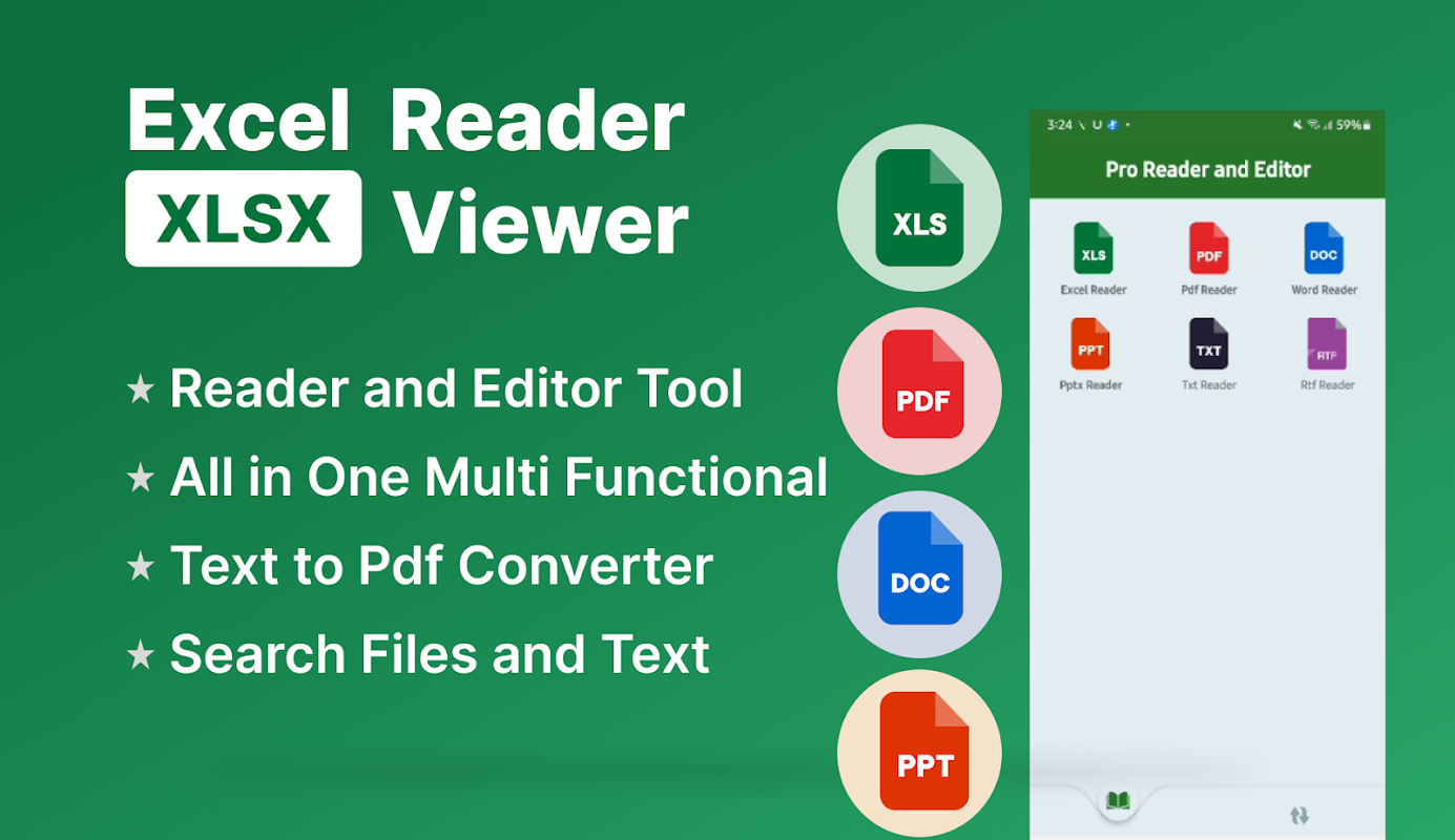 Pembaca Excel: Pemapar XLSX & Pemapar Fail XLS berfungsi sebagai pengurus dokumen excel yang membantu pengguna membaca fail excel dan mengedit fail excel. XLSX Viewer & XLS File Viewer juga menukar fail excel, word dan pptx ke dalam pdf. Aplikasi pembaca Excel ini ialah aplikasi berbilang fungsi kerana ia juga berfungsi sebagai pembaca pdf, editor pdf, pembaca excel - xlsx - xlsx dan baca dan edit perkataan, fail pptx.