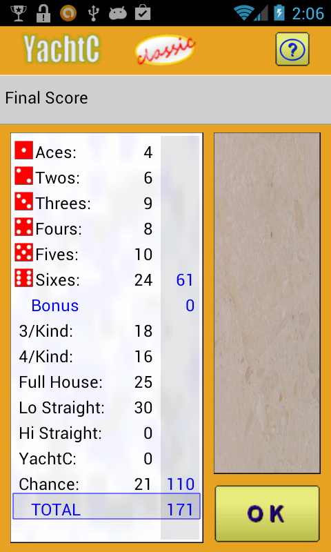 Versi permainan dadu klasik, dengan kaedah-kaedah yang betul! Sama seperti Yahtzee ¹ terkenal dan orang ramai permainan domain Layar.