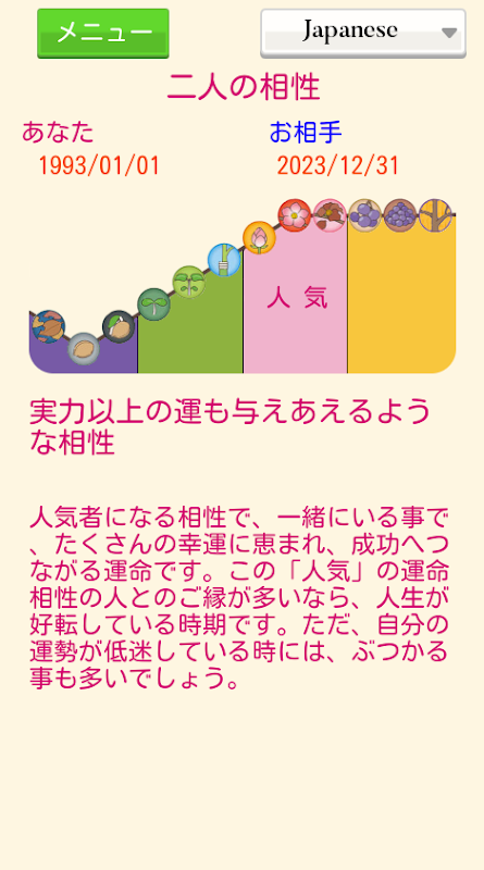 - Anda dapat memeriksa kepribadian Anda, keberuntungan tahunan, keberuntungan bulanan, keberuntungan harian, dan kompatibilitas.