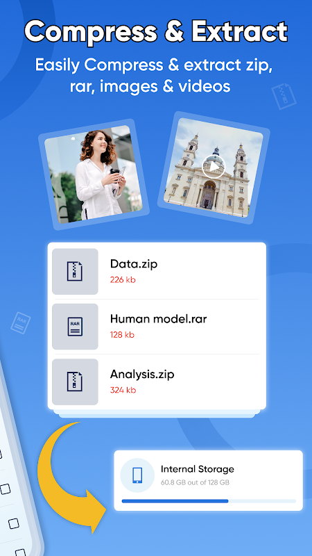 Selain itu, apl / penyahmampatan zip membenarkan pengguna menyahzip fail yang disimpan pada peranti. Jika pengguna ingin bekerja dengan fail zip, mereka dikehendaki menyahzipnya terlebih dahulu. Oleh itu, alat ini adalah sama penting dan berfaedah untuk pengguna. Pembaca fail zip muat turun percuma / 压缩 mempunyai lapan kategori termasuk; arkibkan fail, fail yang diekstrak, semua fail, imej, video, audio, dokumen dan fail kegemaran saya. Selain itu, apl pembaca zip menunjukkan storan dalaman peranti. Melalui ciri ini, pengguna boleh menentukan ruang kosong dan jumlah ruang peranti. Akhirnya, pengguna juga boleh berkongsi aplikasi zip dan unzip dengan rakan dan keluarganya dengan hanya satu klik.