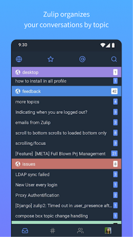 Tidak seperti apl sembang lain, Zulip membenarkan anda membaca dan membalas setiap mesej dalam konteks, tidak kira bila ia dihantar. Kekalkan tumpuan anda dan kemudian ambil masa anda sendiri, membaca topik yang anda minati, dan meluncur atau melangkau yang lain.
