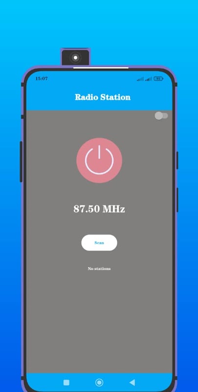 A modern interface with a clean black background, an intuitive layout, and vibrant orange accents. It includes a prominent power button, frequency display, a sleek scan button, and a station list.