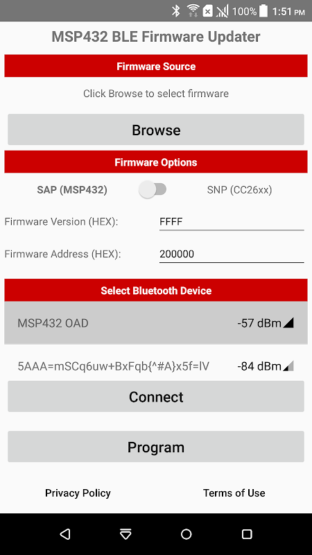 The MSP432 BLE Firmware Updater is a lean and powerful mobile application that will perform an over-the-air download (OAD) of the firmware image running on you MSP432P4 device. In addition to having the ability to update the firmware running on the MSP432, the MSP432 BLE Firmware Updater can also update the firmware of the attached SNP device (CC26XX).