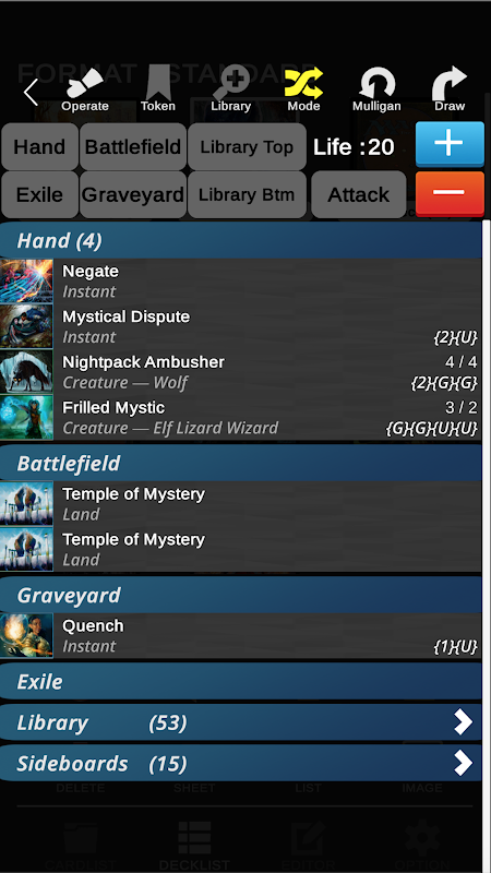 - Format selection (Manage decks for each format)
