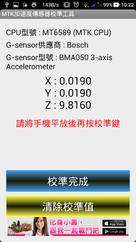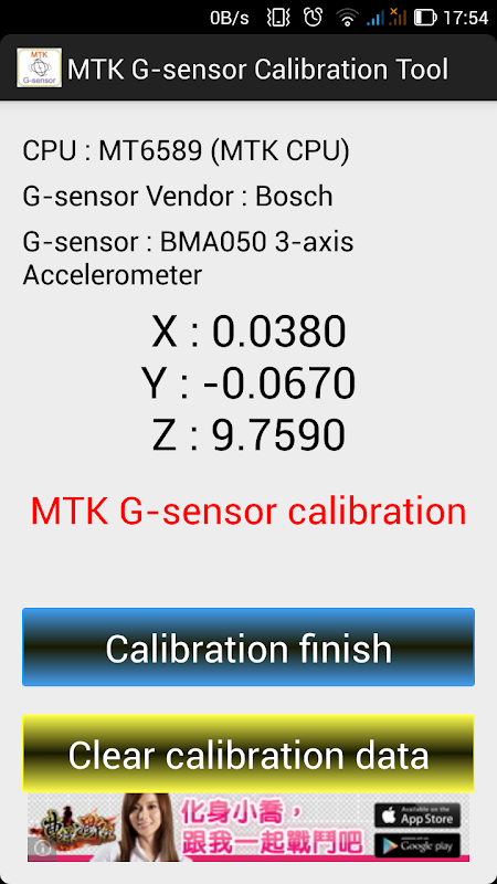 1. This App only calibration Media-Tek CPU platform's G-sensor, Can't not Calibration other platforms.
