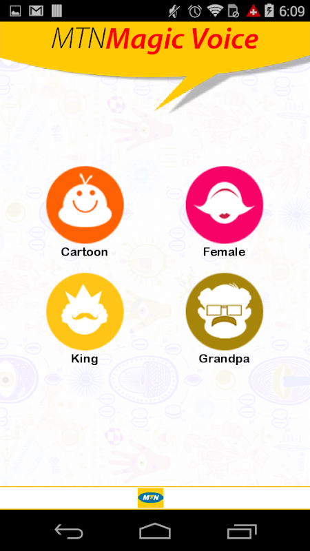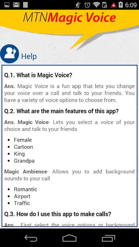 Have you ever tried to talk to your friends in cartoon's or grandpa's voice? With the Magic Voice application you can change your voice without any effort at all! Select the voice you would like to use and in a second you will be calling your friends with the voice of a cartoon, a sick person’s voice, or a woman if you are a man! Add Magic ambience to your call and your friends will hear background sounds as if you are in traffic, at the airport, in the middle of a romantic moment and more.