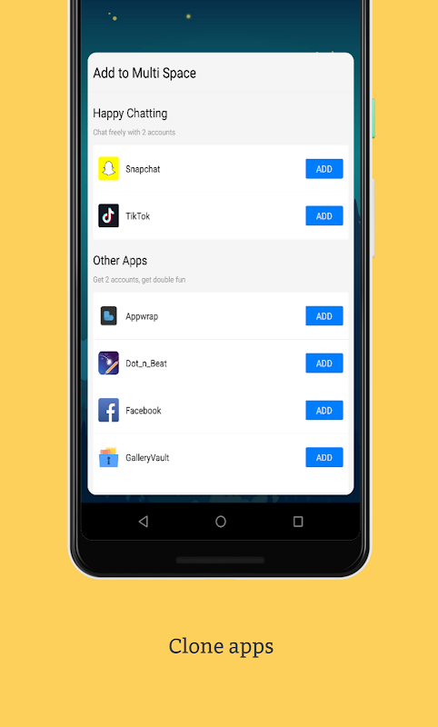 ⢠Almost all apps are supported for multiple account in Multi Cloner. Data from both accounts won't interfere with each other.