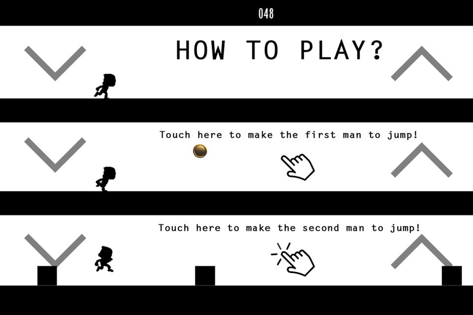 You have to tap the white zone to make the runner (the shadow is running) jump or roll over the obstacles at the same time.