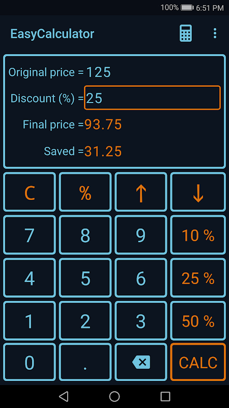 - Memory available: Easy Calculator saves your calculations. In addition, it is possible to share or use them during the input.
