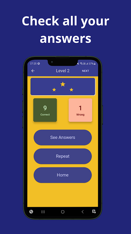 It's a game with several levels, to pass the level you have to get 60% of the questions right, at the end of the level the player will know how many stars he has won and know the amount of answers