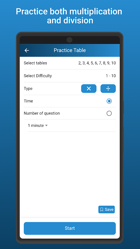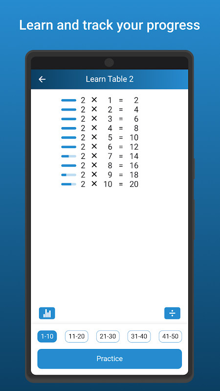 1-50 Tables: Master multiplication and division tables from 1 to 50! The app ensures a comprehensive learning experience, covering a wide range of numerical combinations.