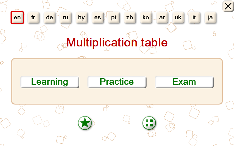 Educational application for mathematics "Multiplication tables" consists of 3 sections: learning, practice, exam.