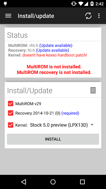 MultiROM is one-of-a-kind multi-boot mod for Android devices. It can boot any Android ROM as well as other systems like Ubuntu Touch. Besides booting from device's internal memory, MultiROM can boot from USB drive connected to the device via OTG cable. The main part of MultiROM is a boot manager, which appears every time your device starts and lets you choose ROM to boot. You can see how it looks on the left image below and in gallery. ROMs are installed and managed via modified TWRP recovery. You can use standard ZIP files to install secondary Android ROMs, daily prebuilt image files to install Ubuntu Touch and MultiROM even has its own installer system, which can be used to ship other Linux-based systems.