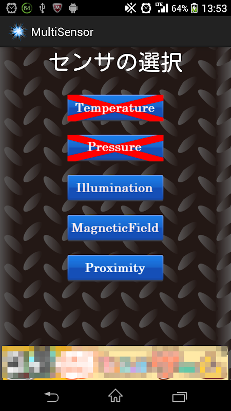 MultiSensorは端末に搭載されたセンサーを使用して、温度、気圧、照度、磁界、端末画面との近接度合いを測ることができます。