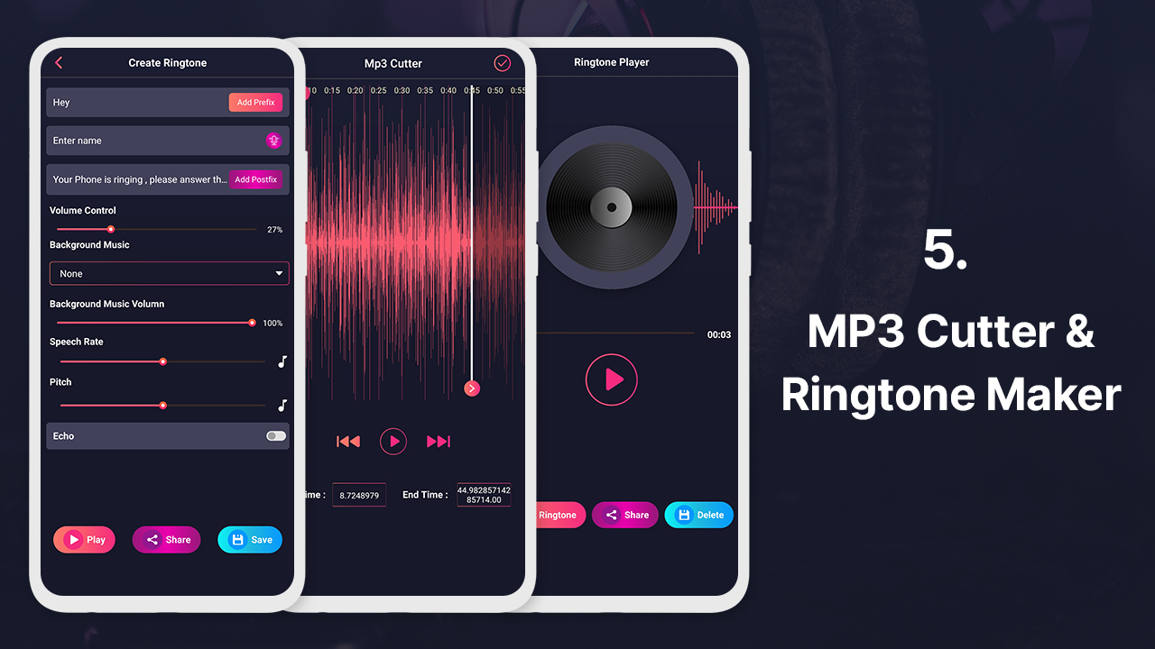 Ringtone Maker feature helps to create personalized free caller ringtones with desired custom text and multiple text suggestions. This is one of the best features for making name music ringtone as your favourite caller tune.