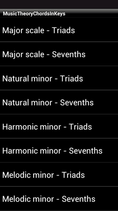 'Music Theory - Chords in Keys' is a music theory app that will train you to think your way around musical keys. You will learn what all the three and four note chords are within all 12 major, natural minor, harmonic minor and melodic minor scales - an extremely useful skill for any musician!