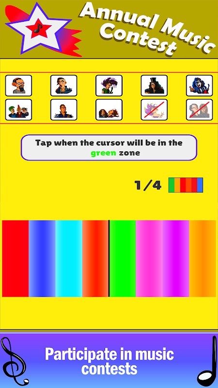 Distribute points in music creation process. Play mini games. Play music instruments and get money from them. Upgrade your music studio.