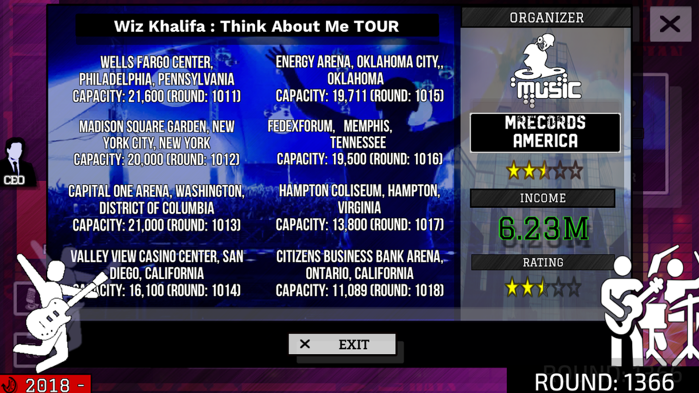 Create a concert tour in arenas all over the world! (250 arenas from around the world available + music festivals!)