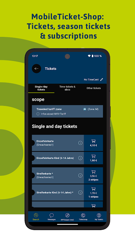 • MVV MobileTickets & Deutschland-Ticket: Our MVV-App is the ticket machine for your pocket - with just a few clicks you can purchase the Deutschland-Ticket (Germany-wide local public Transport ticket on subscription) as well as all our MVV-Tickets and the CityTourCard and Munich Card.