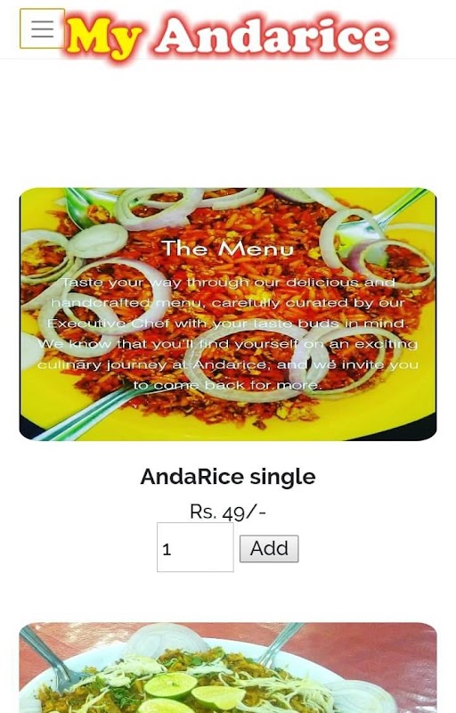 Andarice is an Indian Fast Food company founded in 2019. As a Restaurant Operated by Amar warekar. This Dish belong to yavatamal. They Rechirstened their bussiness as a eggs and rice stand & letter turned the company into Franchise with a being Introduced 2019 Andarice Corporation. This simplified Menu & food preparation using assembly line principle allowed them to sell andarice Only 69 Rs prize single Dish.and Double prize 79 Rs Only. Or about half restaurant was very successful by two best partner started to Online Dish selling and franchise the concept in 2019.