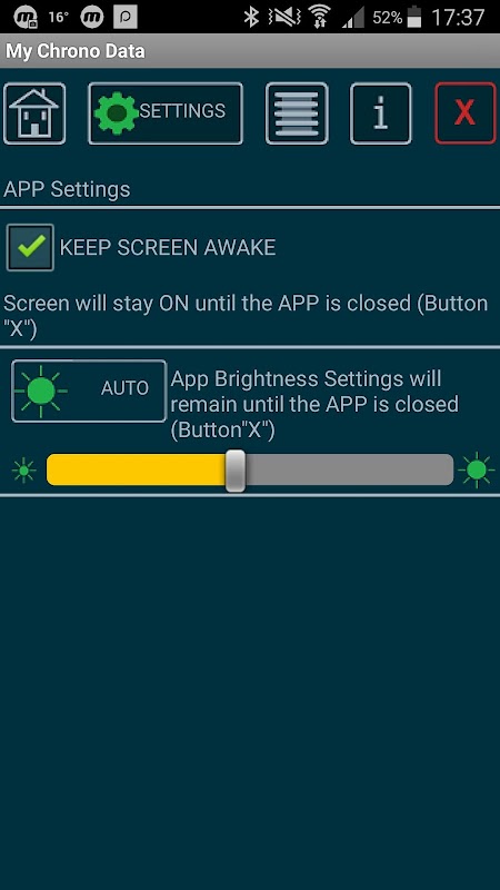 Chrono, Save Data, Retrieve Data and Share. Optional Screen settings.