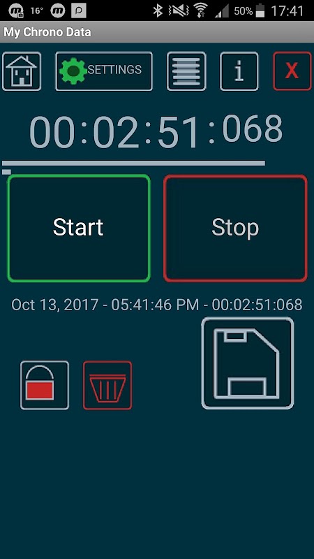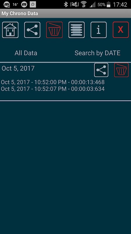 Chrono or Stopwatch events, with a safe Delete Button to prevents unintentional discarding.