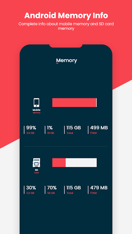 - Memory Usage – Memory stats of the device displays here. Free, used and total memory will be displayed.