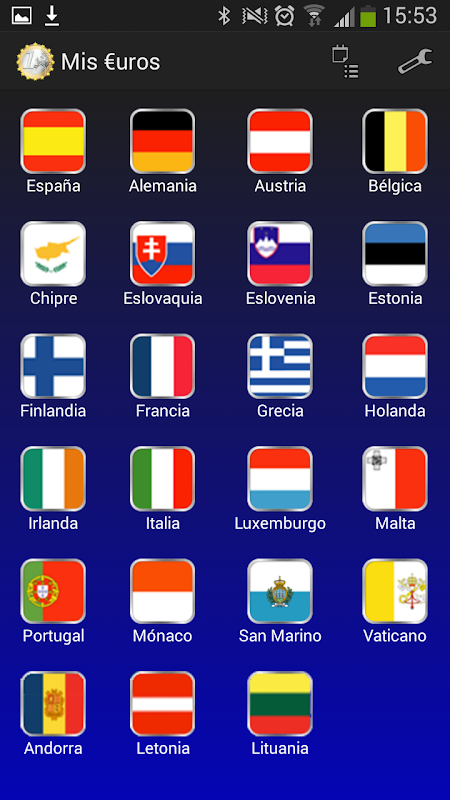 The main window offer a quick view all of Euro countries. A long click over the country flag provide the Euro coin country information.