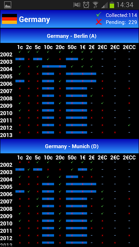 My Euros offer you the posibility of manage your Euro coin collection taking into consideration the differents €uro countries with their years and different mints. In addition, a quick view is included to see a Euro coins resume for a country of your Euro collector.