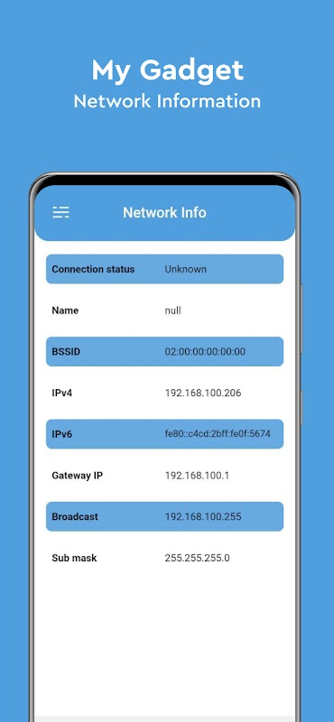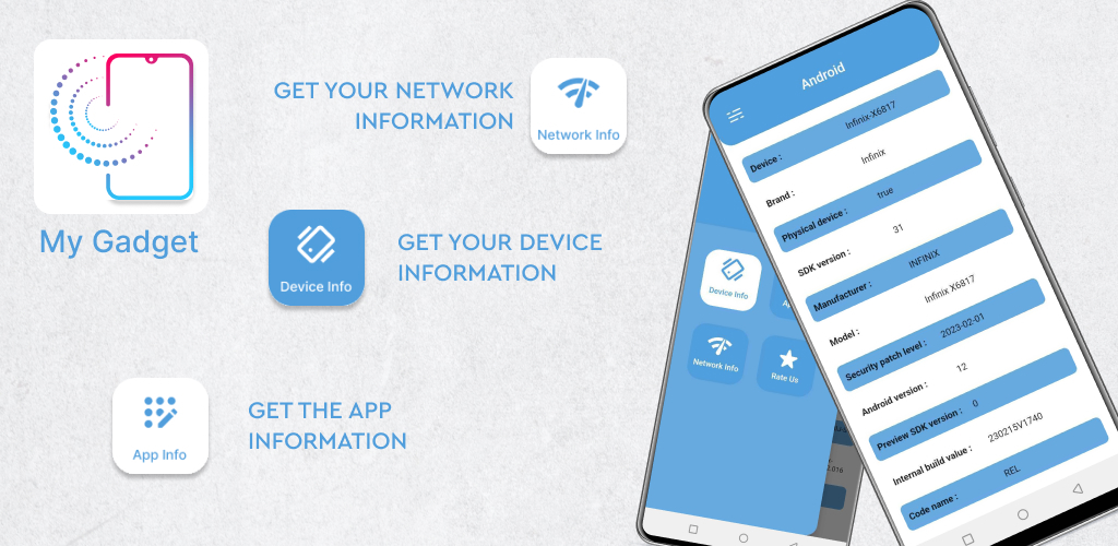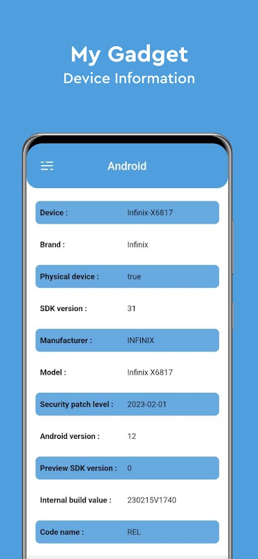 My Gadget : Device Info is a simple and powerful Android application that gives you complete information about your mobile device with advanced user interfaces and widgets. For example, device Info/ phone Info includes information about CPU, RAM, OS, Sensors, Storage, Battery, SIM, Bluetooth, Network, etc.
