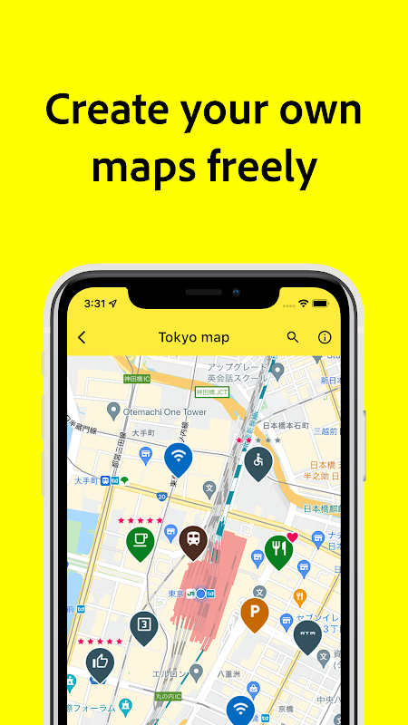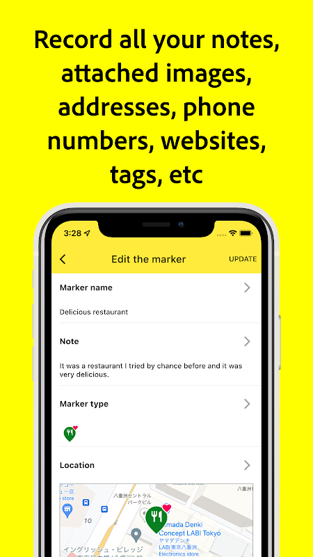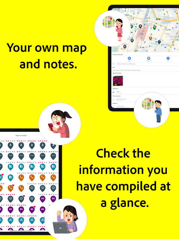 Each marker can register information such as notes, attached images, phone numbers, and websites.