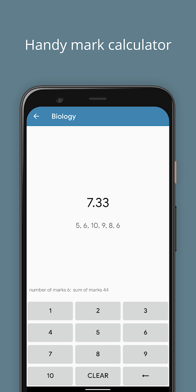 My Marks is an electronic version of a student's record book. It helps you keep an eye on your grades and quickly calculate average marks.