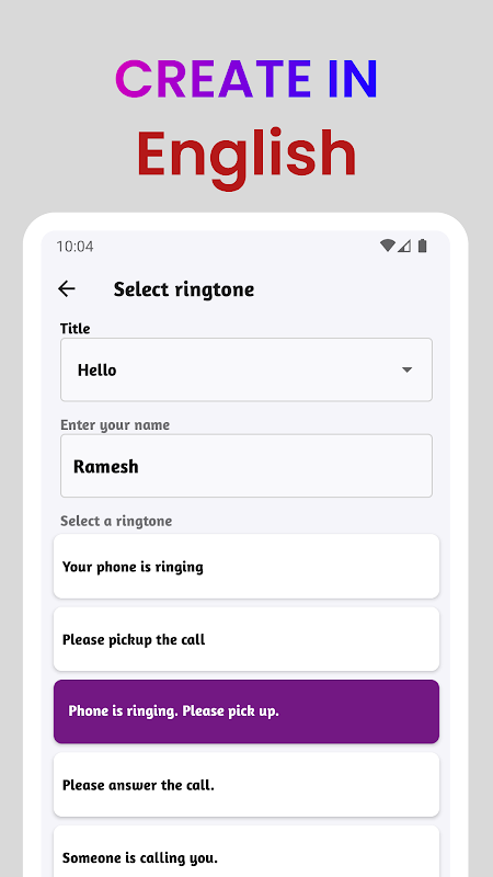 Just choose ringtone language on home screen and enter the name. Finally choose desired text ringtone and click next. Your name ringtone will be ready in few seconds.