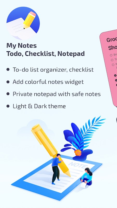 My Notes - Todo, Checklist, Notepad app is quick, simple to use organizer and remarkable note-taking colorful widget and it will serve as an invaluable tool helping you to remember necessary pieces of information and keep notes of shopping list in the mall!
