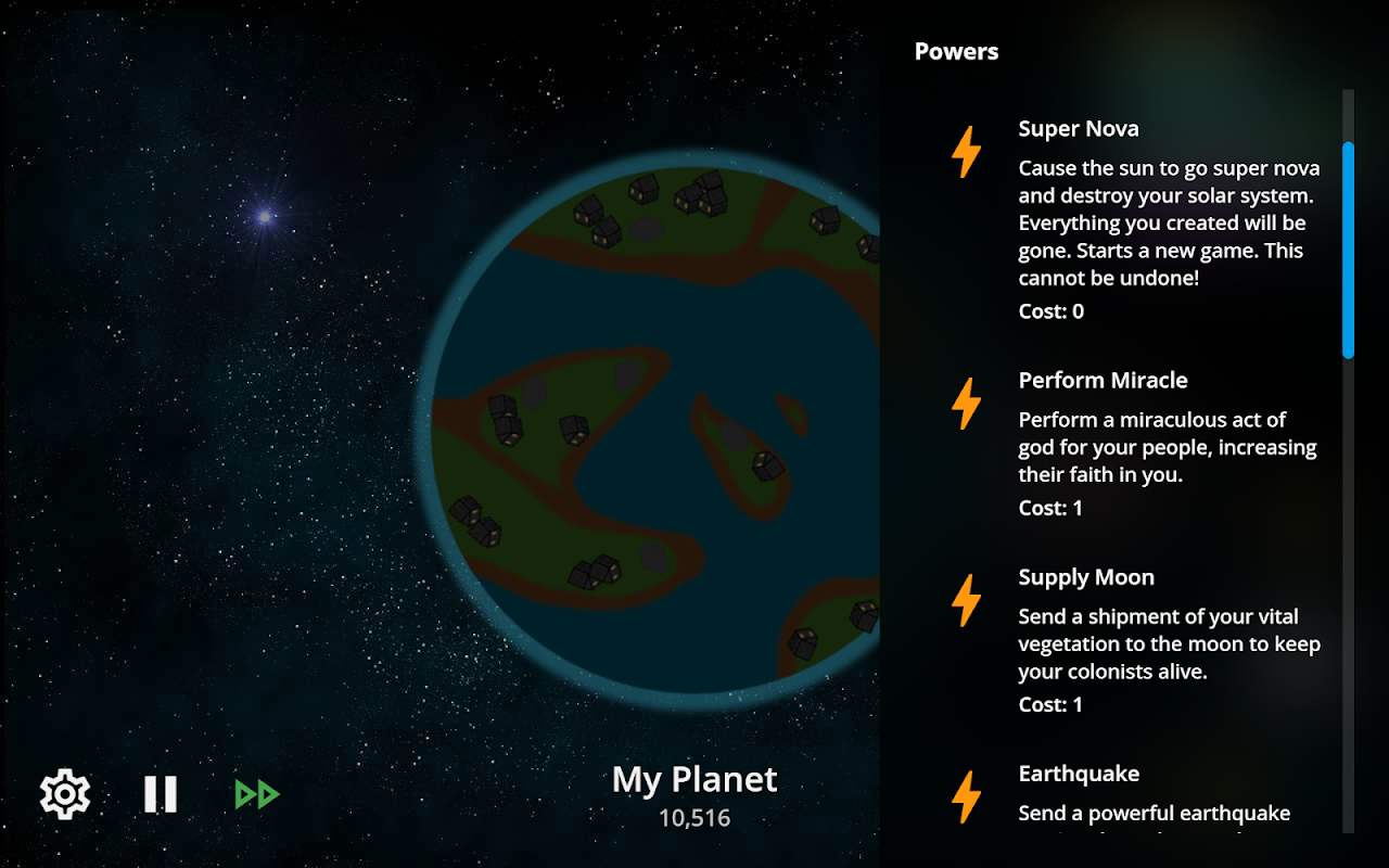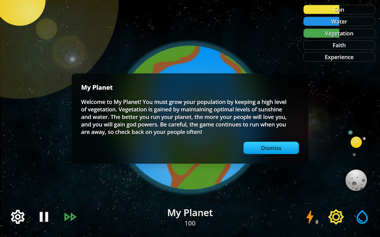 My Planet runs in real time, even when the the game is closed. Therefore, you must keep checking back throughout the day to make sure your planet is running at optimal levels. The controls are simple to use, by mastery can take weeks. Can you achieve the ultimate goal of growing your planet to over 1,000,000 people? Or will your planet burn under the sun while your people anguish? The choice is yours!