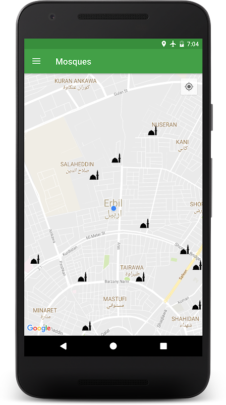 • Nearest Mosques, It's based on google maps and shows you the nearest mosques to you on the map from the nearest to the furthest from you in a radius that you can selected 5-50 Kilometers.