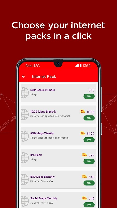 7. Buy Internet Packs, Bundles or Activate Rate Cutters in a click anytime.
