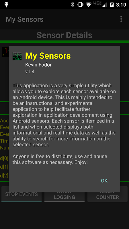 This application is a very simple utility which allows you to explore each sensor available on an Android device. This is mainly intended to be an instructional and experimental application providing a basis for further development. This application displays both static and real-time information about each sensor available. Additionally it allows real-time logging of sensor data to a file stored on your device.