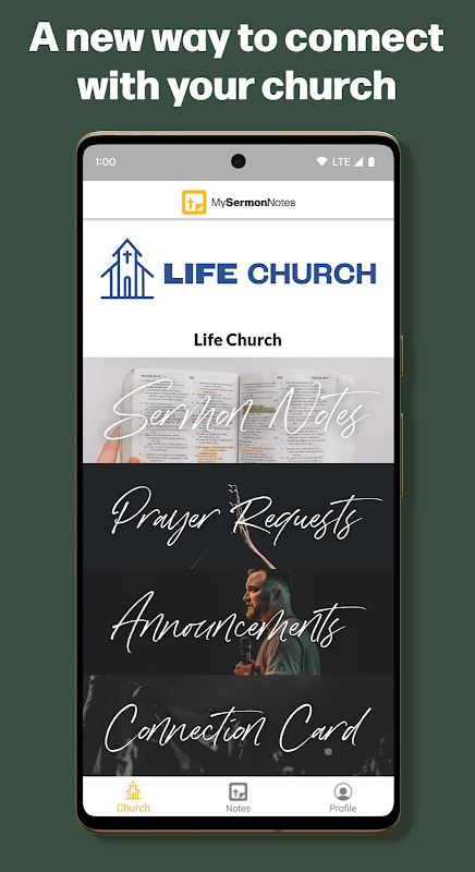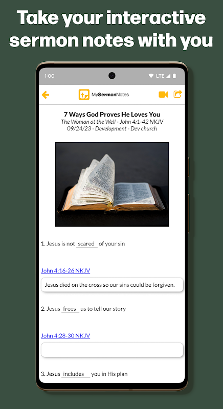Take interactive, fill-in-the-blank sermon notes at your church with My Sermon Notes. You can also interact with your church in other ways, including prayer requests, announcements, and more.