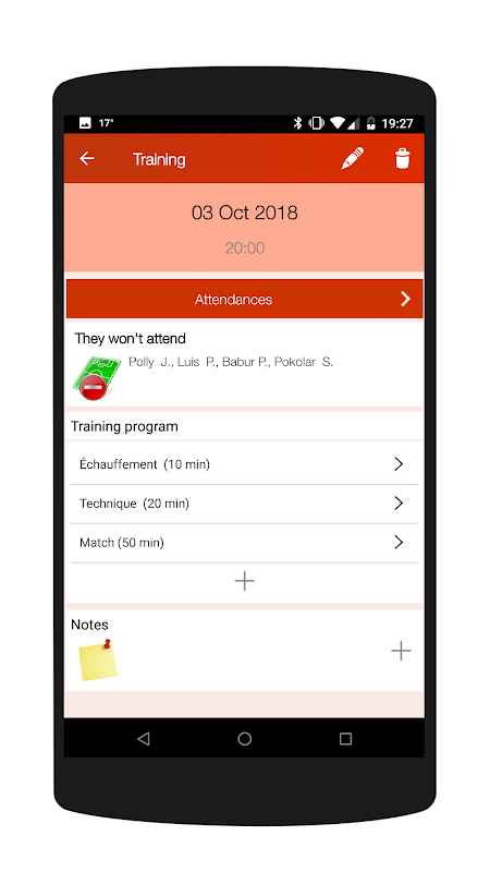 - Push notifications for the players to recall matches and trainings and to ask their availability